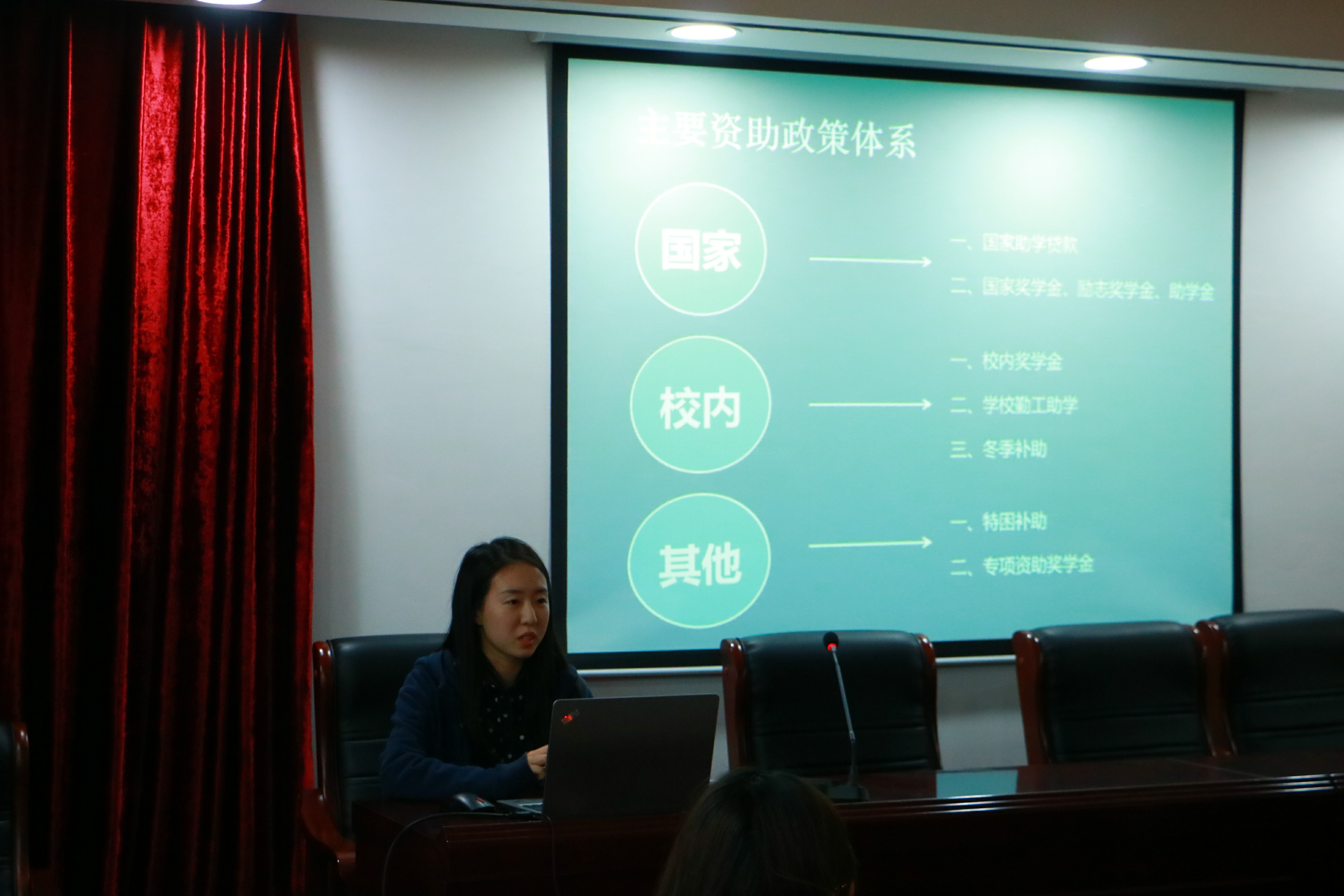 新葡萄官网于3月12日中午在教学科研楼A828会议室开展资助政策宣讲会。会议由新葡萄官网资助工作协理员杨惠茹主讲,各年级学生代表共计60余人参会。