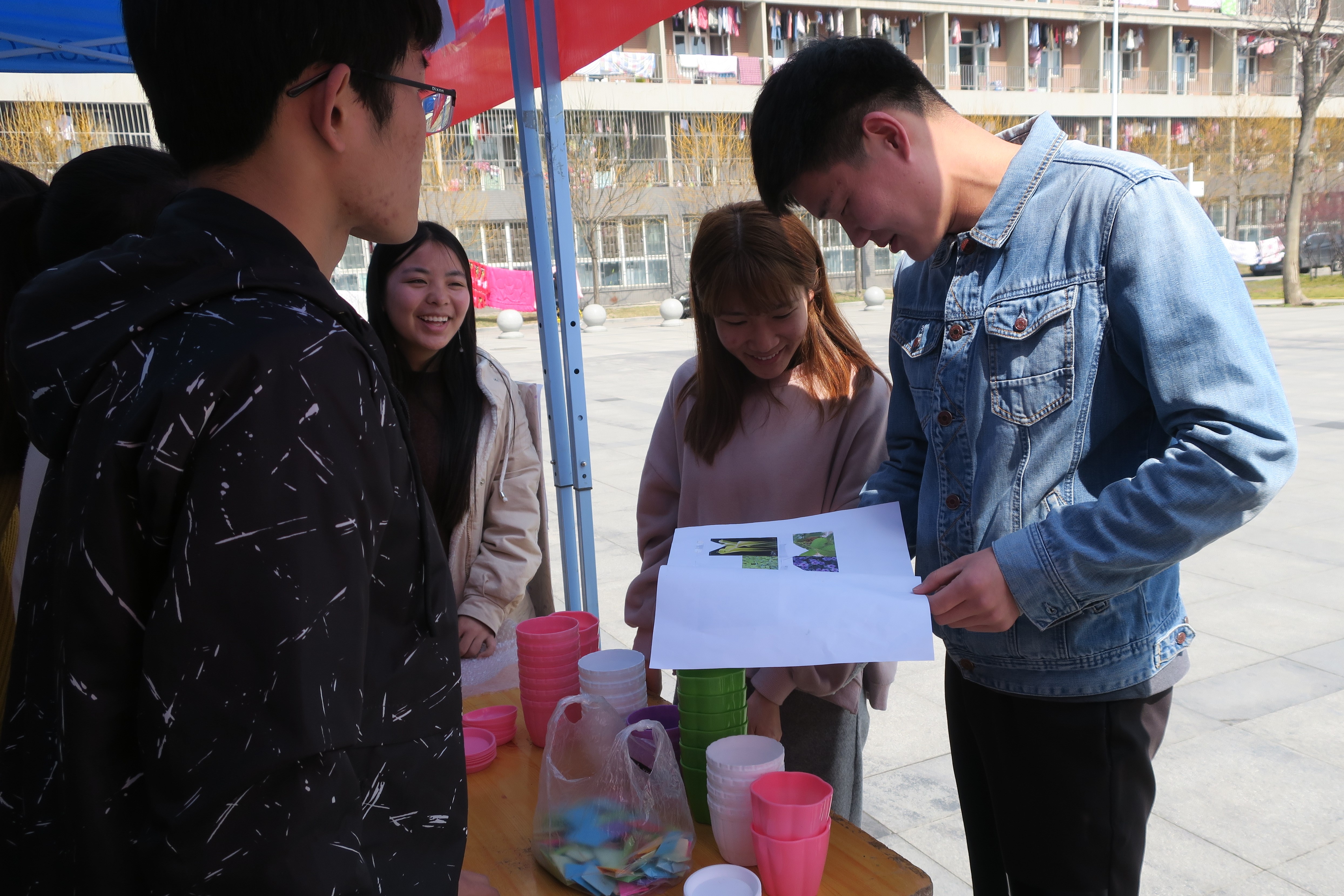 活动前期,社团准备了洋溢着春天希望的盆栽和花种;精心制作了色彩鲜艳、内容丰富的活动展板,绿植、新能源汽车、造林面积统计表等节日代表性元素纷纷呈现。活动中,社团成员们向大家普及我国植被现状的基本情况,并邀请同学们参加小游戏——看植物照片猜植物名称,来获得盆栽和花种的奖励。此外,活动还设置了“绿色出行,低碳减排”签名环节。