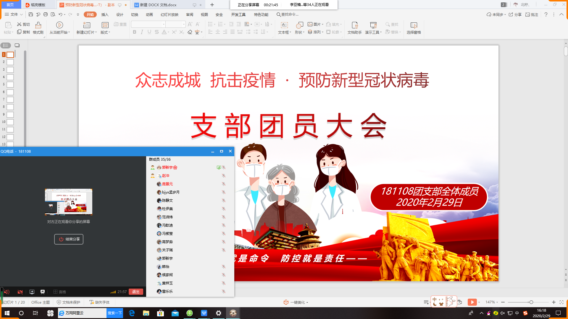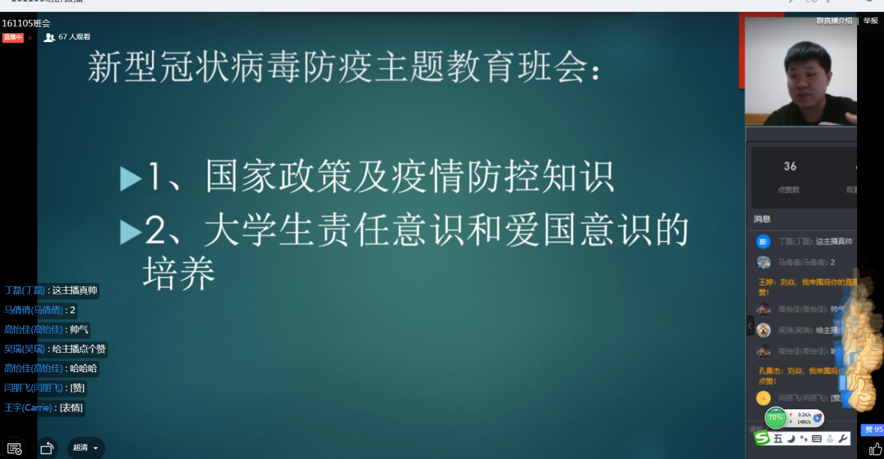 各班积极响应,通过视频会议、直播等形式开展了本次疫情防控团员大会。班长、团支书在会议上安排了工作,明确团干、班委有相应责任,要做好各项信息的报送协助工作。会议强调,各位团员要有主动工作意识,提高政治站位,确保防控工作万无一失。