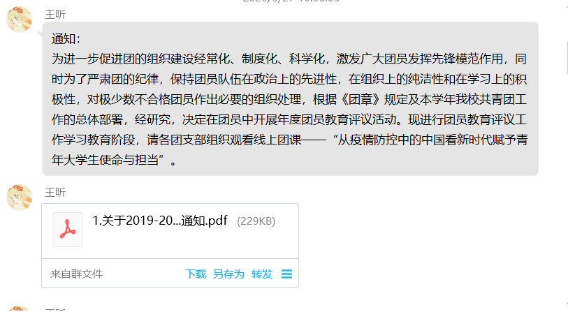 根据《团章》规定及本学年我校共青团工作的总体部署,新葡萄官网于3月27日开展线上年度团员教育评议活动。各团支部积极组织团员观看线上团课——“从疫情防控中的中国看新时代赋予青年大学生使命与担当”。