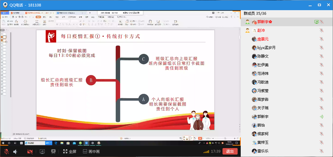 在团课培训会上,各班团支书及班长提出了疫情防控的明确要求,班内每个团干都要积极投入排查工作,共同加入班级疫情防控工作,要求班内所有人都要做到按时打卡,做好各项信息的报送协助工作。同时着重指出每天身体健康情况一定要如实上报,不得瞒报。疫情防控是我们每一个人的责任,一定要压实责任,各位团员要有主动工作意识,严防死守,确保防控工作万无一失。最后各班强调一定要及时关注群消息,在疫情面前不能掉以轻心,认真做好防护隔离措施,为开学做好准备。
