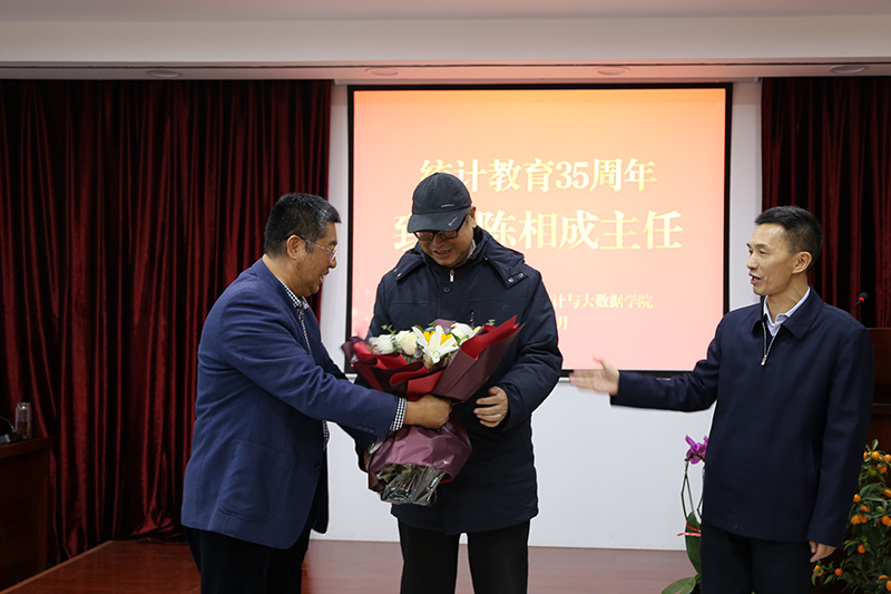 院长刘定平致辞,回顾了统计教育35年的风雨欢歌,高度评价了陈相成教授的经历和成就,表达了深切感激与崇高敬意。院党委书记徐金安为陈相成教授颁发奖杯。